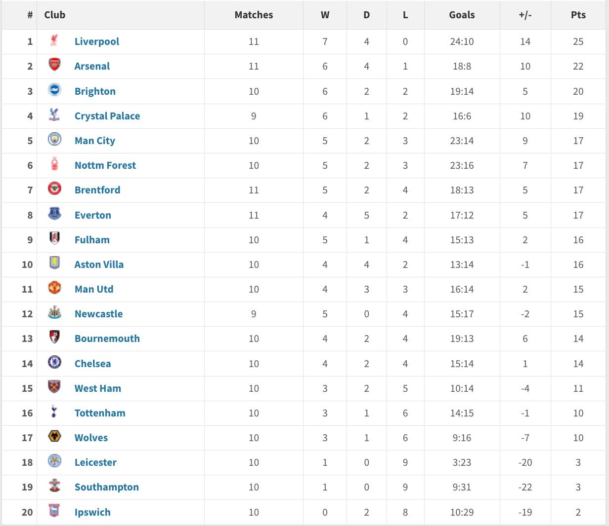 本轮热刺队仅仅收获一场平局,不过他们仍旧以净胜球的优势排在榜首利物浦队获得1分之后,积25分暂时排在第2位莱斯特城本轮取得大胜,球队积24分排名第3位,落后榜首只有1分南安普顿取胜之后跻身前四阿森纳在本轮输球之后遭遇三连败,目前他们积13分排名联赛第15位。